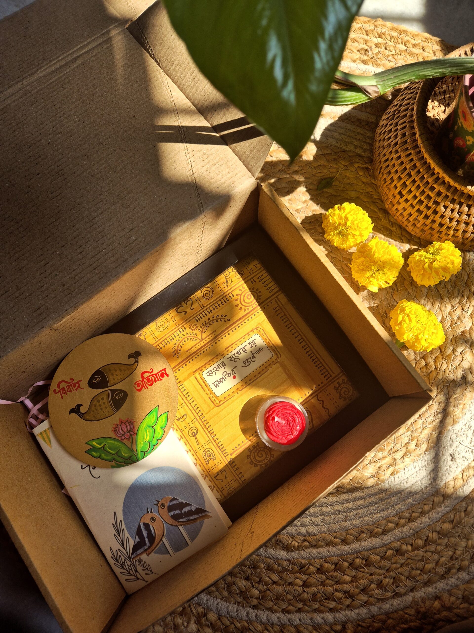 Make every wedding celebration more special with our beautifully curated handmade wedding gift box, thoughtfully designed to express love, warmth, and creativity. Each box includes a hand-painted 6×6 inch framed artwork, a hand-painted coaster or fridge magnet,a cute little greetings card for personalised note and a handmade scented candle, making it a truly unique and meaningful gift for couples.