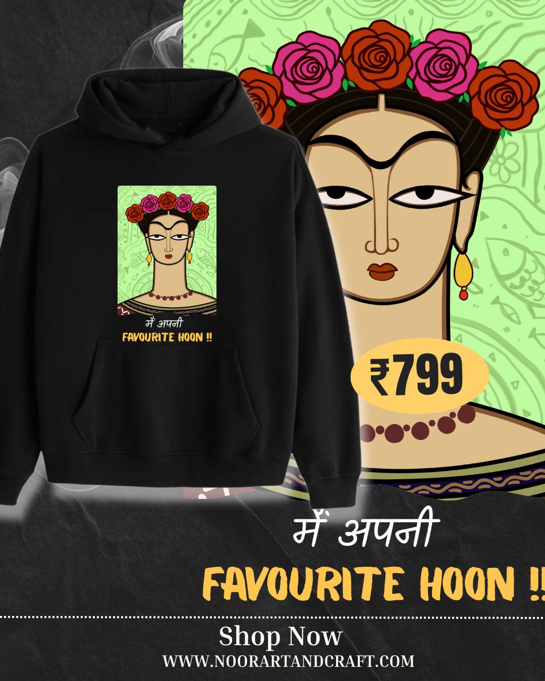 Express your individuality with the Winter Hoodie – Frida, an artistic celebration of confidence, color, and creativity. Inspired by Frida Kahlo, one of the world’s most iconic painters and symbols of self-expression, this hoodie carries the powerful Hindi statement — “Main Apni Favourite Hoon!!” — meaning “I am my own favorite!”